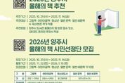 [와이뉴스] 양주시가 11월 14일까지 2026년 양주시 『올해의 책』을 추천받는다. 2026년 양주시 『올해의 책』 선정은 시민들의 참여로 선정한 도서를 다양한 연계 프로그램을 통해 함께 읽고 소통하는 등 독서 문화를 확산시키기 위해 추진된다. 양주시 올해의 책은 ▲그림책, ▲어린이글책, ▲청소년, ▲일반 문학, ▲일반 비문학 5개 부문의 시민 추천 도서를 대상으로 각 부문별 시민선정단의 회의를 거친 후 시민 선호도 조사와 도서선정 최종 회의를 통해 선정된다. 선정된 도서는 2026년 『올해의 책』 작가 초청 강연과 스쿨북 릴레이, 북 크로싱 독서 운동 등 다양한 독서문화 진흥사업에 활용할 예정이다. 양주시민이라면 누구나 올해의 책을 추천할 수 있으며, 가까운 공공도서관에 방문하거나 도서관 누리집 및 홍보 포스터의 QR코드를 통해 추천할 수 있다. 또한, 시민선정단은 11월 14일까지 모집하며, 도서관 누리집에서 신청서를 작성하여 전자우편 또는 QR코드를 통해 신청할 수 있다. 양주시 관계자는 “올해의 책을 통해 시민들이 함께 읽고 소통하며 독서의 가치와 즐거움을 느낄 수