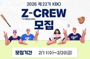 [와이뉴스] KBO가 2월 11일(수)부터 2026 제 22기 KBO Z-CREW(제트크루)를 모집한다. KBO Z-CREW는 기존 ‘대학생 마케터’에서 명칭을 변경하고, 콘텐츠 제작 중심이 아닌 KBO 리그 전반에 참여하는 활동으로 운영 방향을 확대했다. KBO Z-CREW는 한 시즌 동안 KBO 리그의 미래 성장과 팬 경험 강화를 주제로 한 연간 프로젝트를 진행하며, Z세대 관점에서 KBO 리그의 중·장기적 방향성과 신규 사업 아이디어를 제안하고 기획하는 역할을 수행하게 된다. 참여 대학생들은 팀 단위 프로젝트를 통해 KBO 리그 관련 주제를 분석하고, 정기적인 제언과 토의를 통해 실질적인 결과물을 도출할 예정이다. 아울러 KBO 주최 주요 행사 참여를 통해 현장 경험을 쌓고, 프로젝트 결과물과 연계한 콘텐츠 제작 활동도 병행한다. 이를 통해 콘텐츠 제작 중심의 기존 운영 방식에서 나아가, 기획·분석·제언 중심으로 활동 비중을 조정할 예정이다. 이외에도, 프로스포츠 산업 전문가 멘토링 및 정기 회의를 통해 프로스포츠 산업에 대한 전반적인 이해를 돕고, KBO 리그의 발전 방향에 대한 토의를 진행