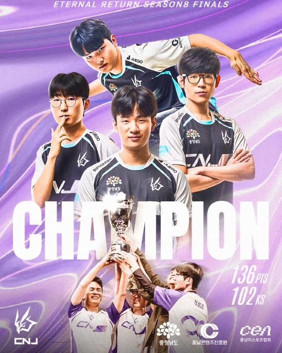 [와이뉴스] (재)충남콘텐츠진흥원은 충청남도를 대표하는 이스포츠 게임단 ‘CNJ Esports가 2025년 10월 12일 대전 드림 아레나에서 열린 이터널 리턴 마스터즈 시즌8 파이널에서 우승을 차지했다고 밝혔다.