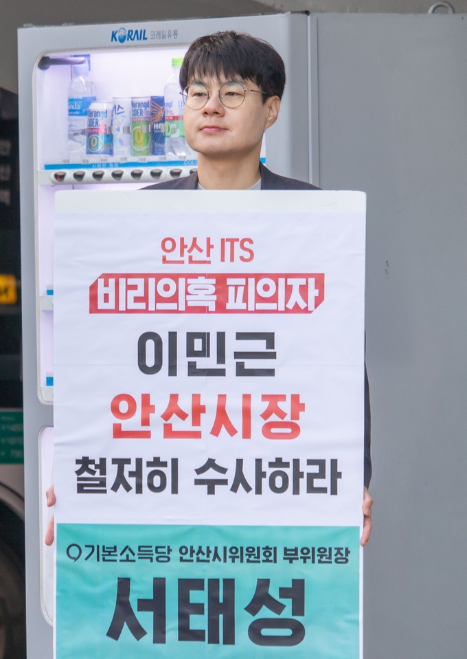 [와이뉴스] 기본소득당 안산시위원회(위원장 용혜인)는 20일 오전 상록수역에서 이민근 안산시장의 ITS(지능형교통체계) 사업 뇌물수수 혐의에 대한 철저한 수사를 촉구하는 1인 피켓팅을 진행했다고 밝혔다. 피켓팅에는 서태성·홍순영 안산시위원회 부위원장이 참여했다.