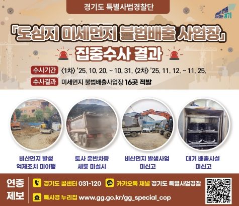 [와이뉴스] 경기도는 도심지 미세먼지 발생사업장 330개를 대상으로 불법 배출 행위를 집중 수사해 대기환경보전법 위반 사업장 16개를 적발했다고 9일 밝혔다.