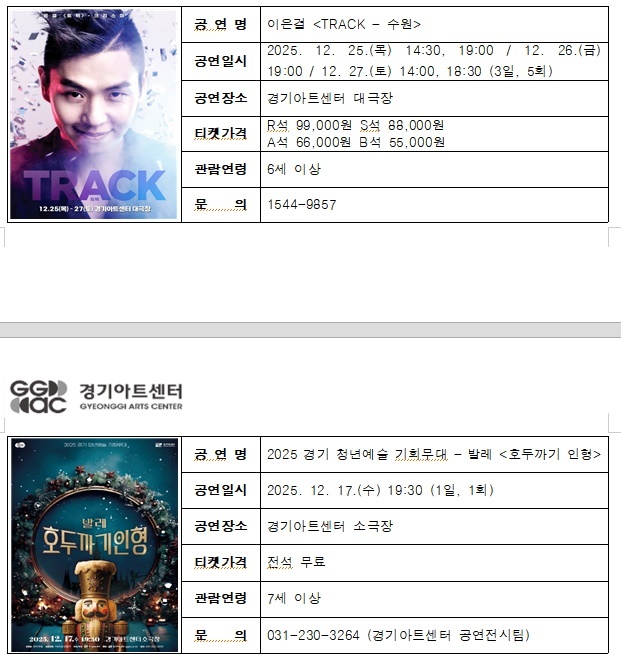 이외에도, 신진 예술인들의 무대가 준비되어 있다. 청년예술인 성장 기반 강화를 위해 경기아트센터가 추진한 <경기 청년예술 기회무대> 참가자들의 공연이 소극장에서 열린다. 12월 17일(수)에는 크리스마스 시즌의 발레 대표작 <호두까기인형>을, 20일(토)에는 ‘탈’을 통해 인간 내면과 감정을 탐색하는 한국무용 <탈, 탈 털어 - 얼굴 너머>를 선보이며, 26일(금)부터 27일(토)까지는 사람 사는 이야기를 그린 연극 <우리 읍내>(손톤 와일더 작)가 열린다. 관람료는 전석 무료다. 힘찬 발걸음을 내딛는 청년예술인들의 재능을 감상하고, 따뜻한 격려와 응원을 보내 보자.