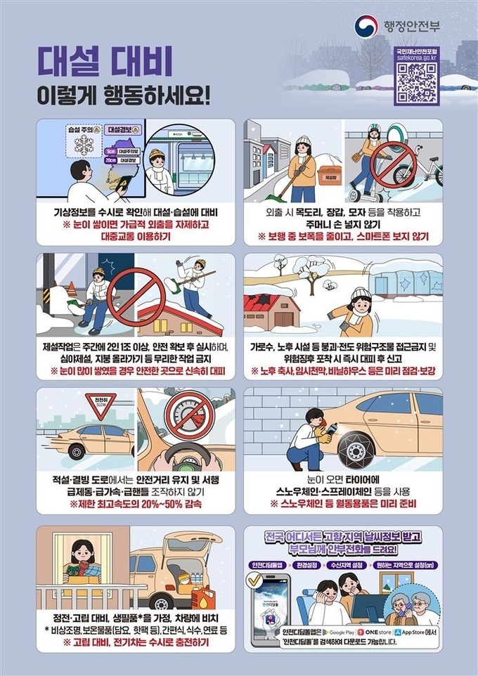 소방서에 따르면 폭설이 예상될 경우 산간 지역과 교통 취약 지역에서는 고립 상황에 대비해 비상 물품을 미리 준비하고, 주택 주변은 수시로 제설 작업을 실시해야 한다.