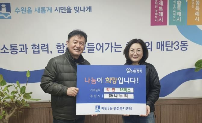 [와이뉴스] 수원시 영통구 매탄3동 행정복지센터는 지난 6일, 관내 폐기물 수거업체인 ㈜나누리로부터 설 명절을 맞아 어려운 이웃을 위한 라면 15박스를 기탁받았다고 밝혔다.