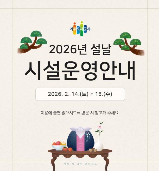 [와이뉴스] 여주도시공사가 다가오는 2026년 설 연휴를 맞아 시민과 귀성객들이 안전하고 편안한 명절을 보낼 수 있도록 주요 시설 운영시간 조정 및 특별 서비스를 시행한다고 밝혔다.