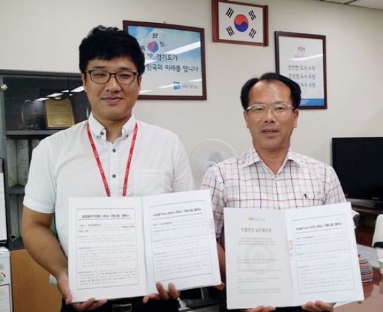 ▲ 수원시가 케이티텔레캅(주)과 협력해 편의점·가게·문구점 등 130개 업소에 ‘비상벨(Foot-SOS)’을 설치한다. 장동훈 수원시 여성정책과장(오른쪽)과 이승범 케이티텔레캅(주) 과장이 업무협약 후 기념촬영을 하고 있다.