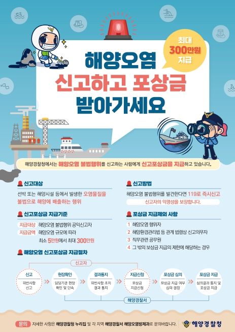 해양경찰은 최근 5년 동안 7,171건의 해양오염 신고가 접수되어, 281건에 대해 3,200만원의 포상금을 지급했다. 그 중 지난해 울산지역 송유관 파손으로 인한 기름유출 사고 신고자에게 최대 금액인 300만원이 지급됐다.
