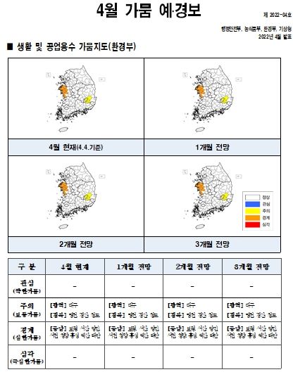 4월 강수량은 평년과 비슷하거나 적겠고, 5~6월은 평년과 비슷하여 일부 지역의 기상가뭄은 6월에는 점차 완화될 것으로 전망했다.