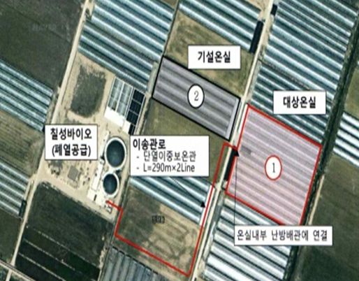 이에 농식품부는 청양군, 한국농어촌공사 및 축산환경관리원과 함께 에너지화 시설의 발전폐열을 시설온실에 제공할 수 있는 이송관로의 설치에 필요한 기술적, 재정적 지원을 작년 하반기부터 추진하여, 290m의 온수 이송관로를 지중으로 설치하고, 시설온실의 난방배관을 통해 작물 생육에 필요한 적정 온도를 유지할 수 있도록 하였다.