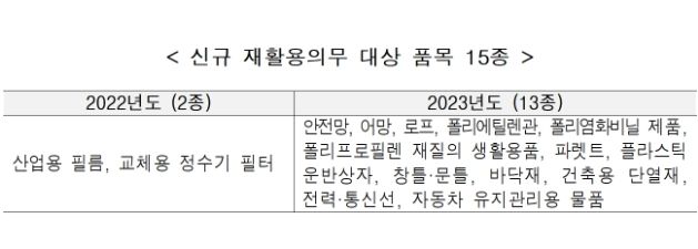 이번 개정에 따라 산업용 필름과 교체용 정수기 필터는 올해 출고 제품부터 재활용 의무 대상이 된다. 안전망, 어망 등 나머지 13종은 2023년 출고 제품부터 적용된다.