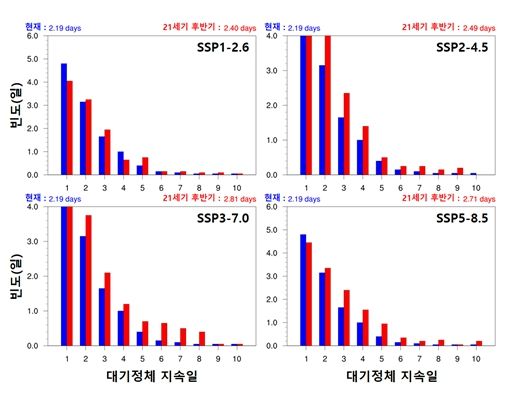 고탄소 시나리오(SSP5-8.5/SSP3-7.0)의 경우, 현재 대비 21세기 후반기에 대기정체는 39.5일∼41.5일 발생하며, 현재 대비 약 51~58% 증가하는 것을 의미한다.