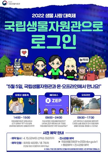 [와이뉴스] 환경부 소속 국립생물자원관(관장 서민환)은 어린이날과 생물다양성의 달을 맞이하여 5월 5일 관내(인천 서구 소재) '생생채움' 전시관에서 '2022 생물 사랑 대축제'를 개최한다.