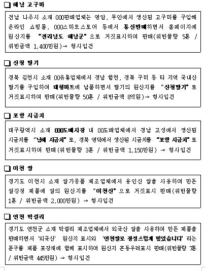 주요 위반사례는 충남 00군 소재 000영농조합법인에서는 청양산과 타 지역(예산, 부여)산 구기자를 혼합하여 인터넷 쇼핑몰에서 통신판매하면서 구기자의 원산지를 “청양산”으로 거짓표시하여 판매(위반물량 6톤 / 위반금액 2억 1천만 원)하다 적발되었고, 대구광역시 소재 000생산농가에서 대구 달성군에서 생산한 참외와 성주산 참외를 혼합하여 관내 농협에 판매하면서 참외의 원산지를 “성주 참외”로 거짓표시하여 판매(위반물량 180톤, 위반금액 7억 2천만 원)하다 적발되었다.