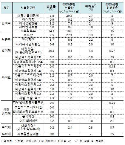 조사 결과, 26개 식품첨가물의 일일추정노출량은 0.0~29.4 ㎍/kg bw/day이며, 위해도는 일일섭취허용량대비 1.4% 이하로 안전한 수준이었다.