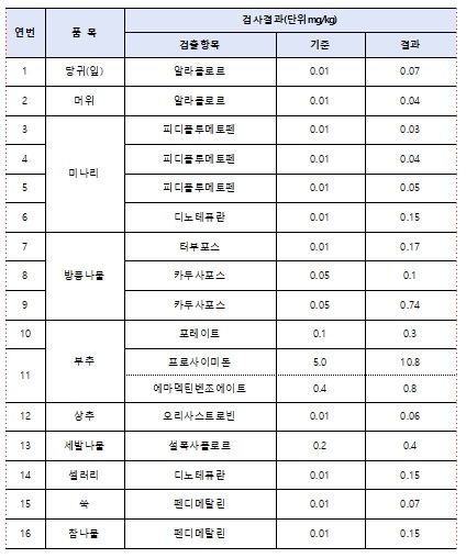 수거·검사 결과, 일부 지역에서 생산하고 있는 미나리, 방풍나물, 부추, 당귀, 머위, 상추, 세발나물, 셀러리, 쑥, 참나물에서 잔류농약이 허용기준보다 초과 검출됐다.