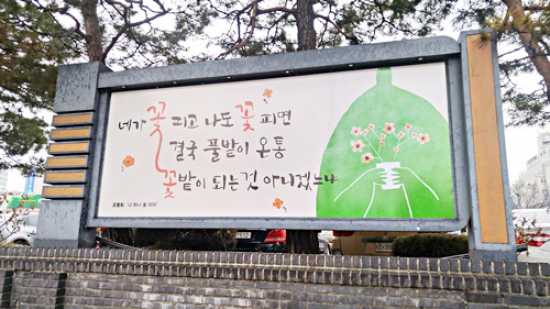 수원시는 수원희망글판 봄 편 문안 ‘네가 꽃 피고 나도 꽃 피면 결국 풀밭이 온통 꽃밭이 되는 것 아니겠느냐’를 이달부터 오는 5월까지 수원시 곳곳에 게시한다.