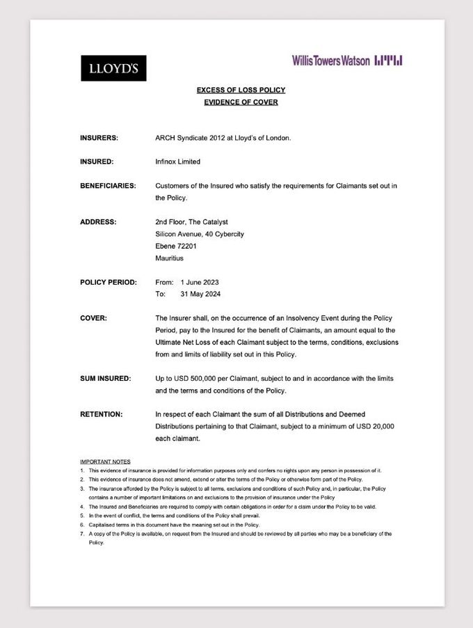 인피녹스는 세계 최대 보험 연합 LLOYDS 보증 아래, 은행 파산 등 지급 불능 사태에 이를 경우 청구인당 최대 $500,000 USD 까지 보호받을 수 있다.