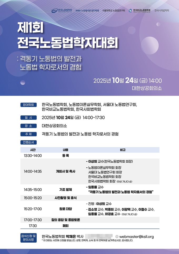 개회사 및 축사는 이상희 교수(한국노동법학회 회장), 노동법이론실무학회 회장, 서울대 노동법연구회 회장, 한국비교노동법학회 회장, 한국사회법학회 회장이 주재한다.