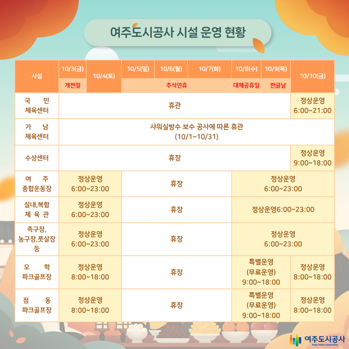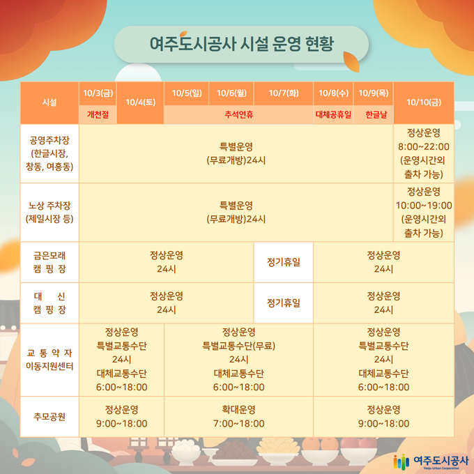 [와이뉴스] 여주도시공사(이하 ‘공사’)는 2025년 추석 명절을 맞아 고향을 찾는 귀성객과 시민들의 편의를 위해 주요 시설 운영시간 조정, 무료개방 등 특별 서비스를 제공한다고 2일 밝혔다.