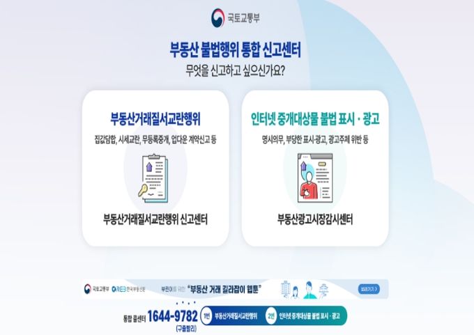아울러, 인터넷 중개대상물 불법 표시·광고 뿐아니라, 집값담합, 시세교란(집값 띄우기 등) 등 부동산거래질서교란행위 전반을 ‘부동산 불법행위 통합 신고센터’를 통해 접수·모니터링하고 있으며, 신고된 사례에 대해서는 지자체와 협력해 엄정 대응해 나갈 계획이다.