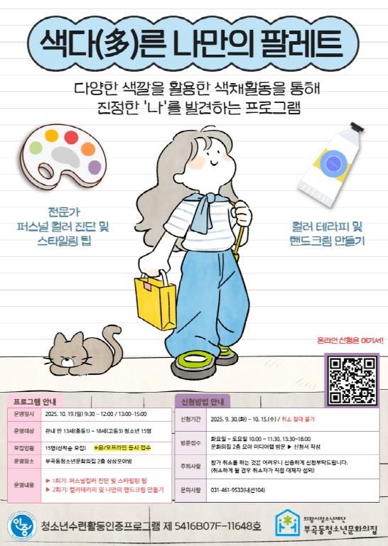 신청은 10월 15일까지 가능하며, 프로그램 안내문의 큐알 코드 접속을 통해 온라인으로 하거나 부곡동청소년문화의집을 직접 방문해 오프라인으로 하면 된다.