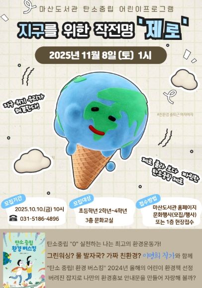 [와이뉴스] 김포시 마산도서관에서 오는 11월 8일 오후 1시부터 3시까지, 초등학교 2학년~4학년 어린이를 대상으로 탄소중립 어린이 프로그램 책풍당당 '지구를 위한 작전명 ‘제로’'를 운영한다.