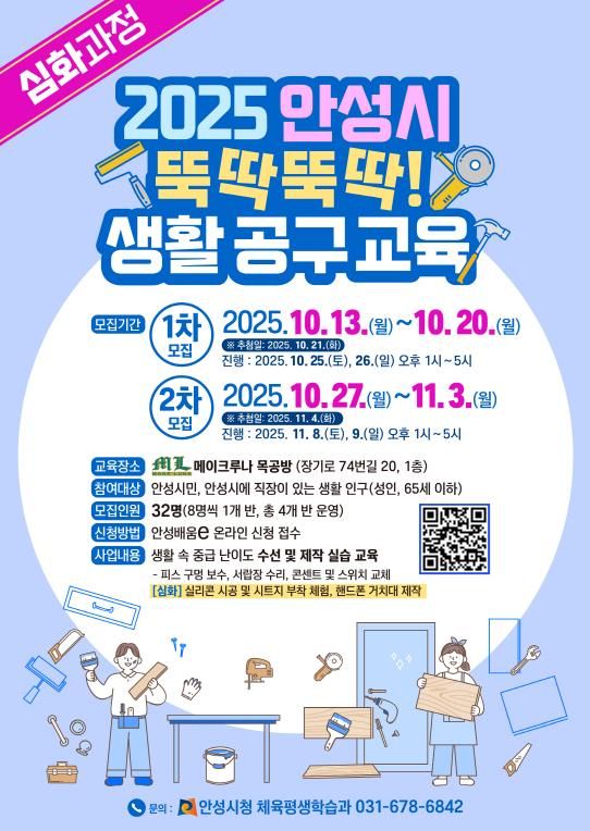 [와이뉴스] 안성시는 시민들의 생활 자립 역량 강화를 위해 '뚝딱뚝딱 생활 공구[심화과정] 교육'을 오는 10월 25~26일과 11월 8~9일, 총 2회 주말 일정으로 운영한다고 밝혔다.