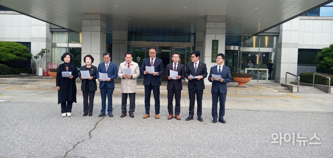 [와이뉴스] 안양시의회 국민의힘 교섭단체 의원 일동이 21일 오전 의회 중앙현관 앞에서 기자회견을 열고 "선거법 위반 혐의로 고발된 최대호 시장은 즉각 사과하고 책임 져야 한다"고 주창했다.