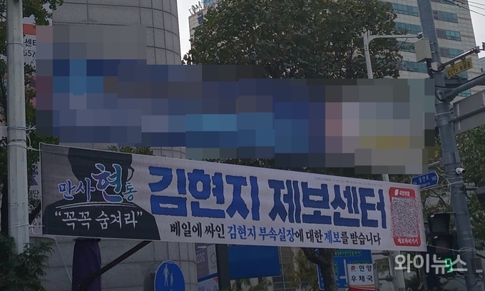 [와이뉴스] 김현지 대통령실 제1부속실장 관련 제보를 받는다는 내용의 펼침막이 게시돼 있다.