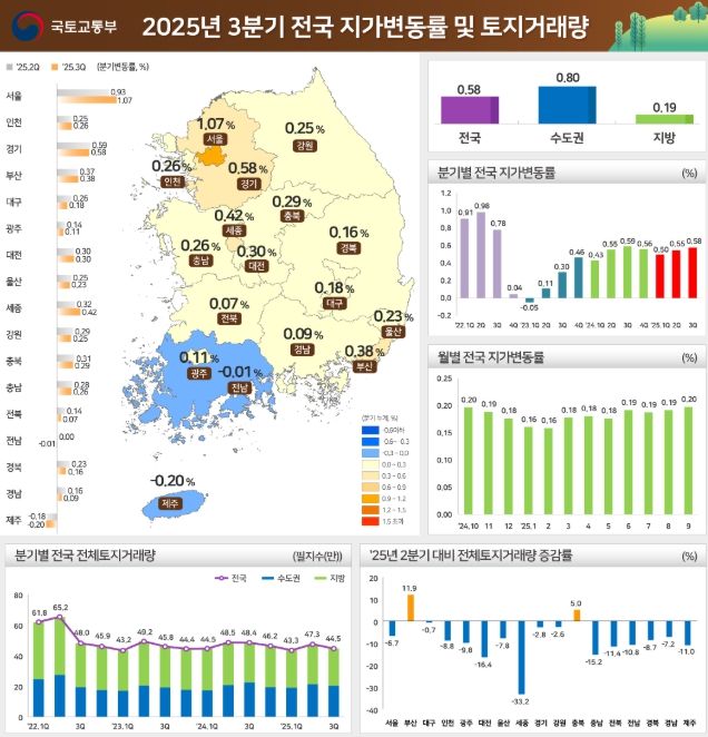 [와이뉴스] 국토교통부와 한국부동산원(원장 손태락)은 '25년 3분기 지가변동률 및 토지거래량을 발표했다.