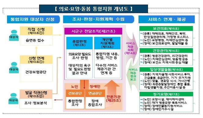 통합돌봄은 일상생활에 어려움을 겪는 사람이 살던 곳에서 건강한 생활을 영위하도록 돌봄지원을 통합하여 제공하기 위한 제도로, 일상생활 유지에 어려움이 있어 복합적인 지원이 필요한 노인, 장애인 등을 대상으로 한다.