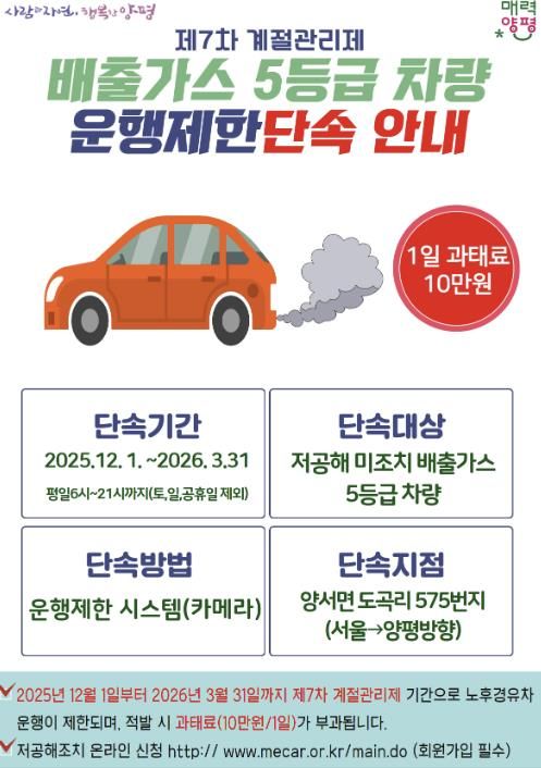 [와이뉴스] 양평군(은 오는 12월 1일부터 2026년 3월 31일까지 제7차 미세먼지 계절 관리제 시행에 따라 배출가스 5등급 차량에 대한 운행 제한 단속을 시행한다고 밝혔다.
