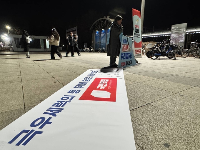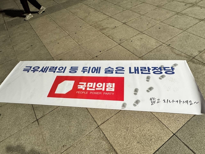 연설과 함께 한대앞역 광장에 ‘극우세력의 등 뒤에 숨은 내란 정당 국민의힘’이라는 현수막을 붙여두어 시민들이 지나가면서 밟을 수 있도록 만들기도 했다. 시민들은 연설에 공감하면서 현수막을 밟으며 진보당을 응원하고 지나갔다.