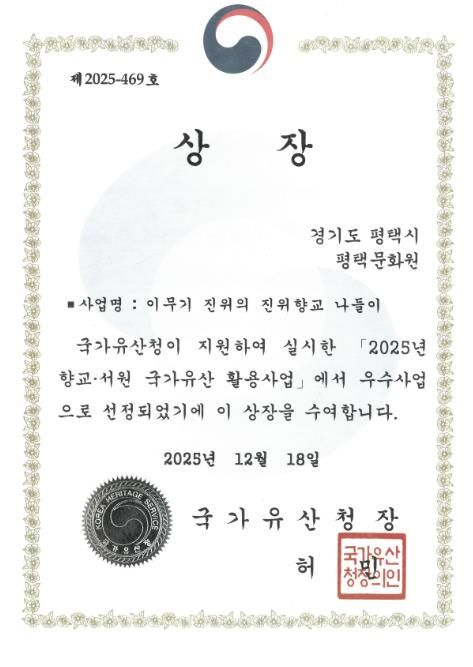 [와이뉴스] 평택문화원은 12월 18일 대전 전통나래관 다목적강당에서 열린 국가유산청 주최 ‘2025 우리고장 국가유산 활용 우수사업 시상식’에서 평택문화원의 ‘이무기 진위의 진위향교 나들이’가 우수사업(국가유산청장상)으로 수상했다.