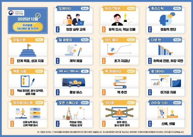 조사 결과 국민이 우리말로 바꾸어 써야 한다고 가장 많이 꼽은 외래 용어는 ‘오제이티’(76.6%)와 ‘빅샷/빅숏’(76.5%), ‘휴리스틱’(74.9%), ‘마일스톤’(74.1%), ‘딜 클로징’(73.5%)이었다. 이에 따라 ‘오제이티’는 ‘현장 실무 교육’으로, ‘빅샷/빅숏’은 ‘유력 인사’ 또는 ‘핵심 인물’로, ‘휴리스틱’은 ‘경험적 판단’으로, 업무 추진 단계에서 기준이 되는 ‘마일스톤’은 ‘단계 목표’ 또는 ‘성과 지표’로, 계약 성사 과정을 뜻하는 ‘딜 클로징’은 ‘계약 체결’로 이해하기 쉽게 다듬었다.
