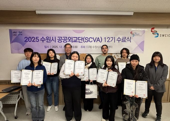 [와이뉴스] 수원시국제교류센터가 22일 센터에서 ‘수원시 공공외교단(SCVA) 12기’ 수료식을 열고, 단원 16명에게 수료증을 전달했다. 우수활동자 4명에게는 상장을 수여했다.