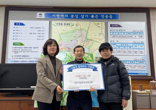 이은영 읍장은 “관내 어려운 이웃을 위해 나눔을 실천하는 안중어울림5일장상인회 회원분들의 따뜻한 마음에 깊은 감사를 드린다”라며, “새해를 맞아 어려운 이웃이 따뜻한 겨울을 보낼 수 있도록 소중히 잘 전달하도록 하겠다”라고 전했다.