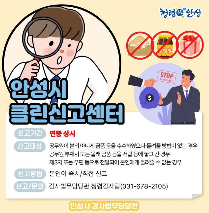[와이뉴스] 안성시는 시민들에게 신뢰받는 공정하고 투명한 행정 서비스를 제공하기 위해 ‘클린신고센터’를 연중 상시운영하며 청렴한 행정문화 정착에 힘쓰고 있다고 밝혔다.
