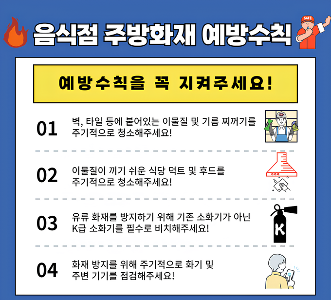 겨울철 음식점 화재를 예방하기 위해 ▲주방 내 가스레인지 주변에 소화기와 K급 소화기를 비치 ▲동‧식물 기름을 제거할 수 있는 필터 등 설치 ▲자동확산소화장치 및 가스차단기를 설치 ▲노후된 전선 교체 등 안전수칙을 준수해야 한다.