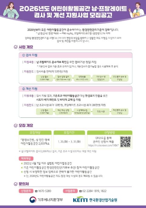 [와이뉴스] 기후에너지환경부와 한국환경산업기술원은 어린이 활동공간에 새롭게 적용되는 환경안전관리기준에 따라 ‘납’과 ‘프탈레이트’에 대한 검사를 지원하고, 기준을 초과한 시설에 대해서는 개선 지원을 추진한다고 밝혔다.