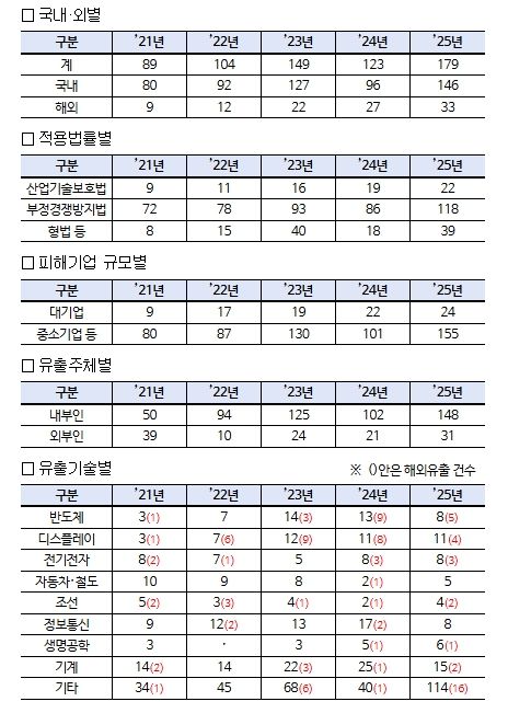 유출 주체는 피해기업 임직원 등 내부인(148건, 82.7%)이 대다수이며, 대기업(24건, 13.4%)보다는 중소기업(155건, 86.6%)이 압도적으로 많은 것으로 확인됐다.