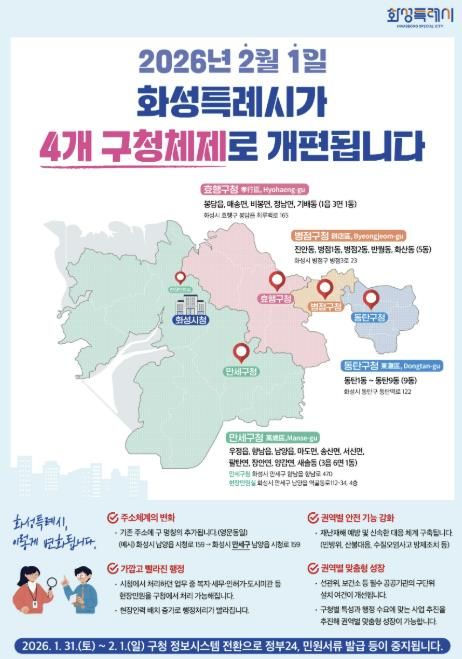 아울러 구청 개청 준비를 위한 행정시스템 데이터 전환 작업으로 인해 오는 31일부터 2월 1일까지 정부24 등 정부시스템을 활용한 각종 민원서류 발급 서비스가 일시적으로 중단된다. 시는 시민 불편을 최소화하기 위해 사전 안내와 대체 민원 처리 안내에 적극 나설 방침이다.