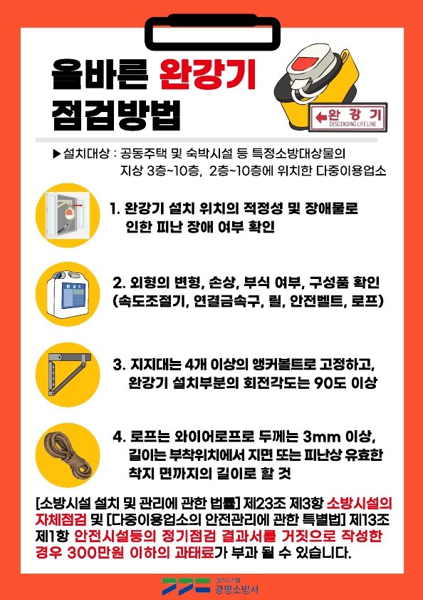 주요 내용으로는 ▲숙박시설 대상 완강기 자체점검 체크리스트 운영 ▲관계인 대상 관리·점검 교육 ▲시민 대상 체험형 완강기 사용교육 ▲완강기 위치 안내표지 설치 홍보 ▲온라인·SNS 카드뉴스 홍보 등이 포함된다.