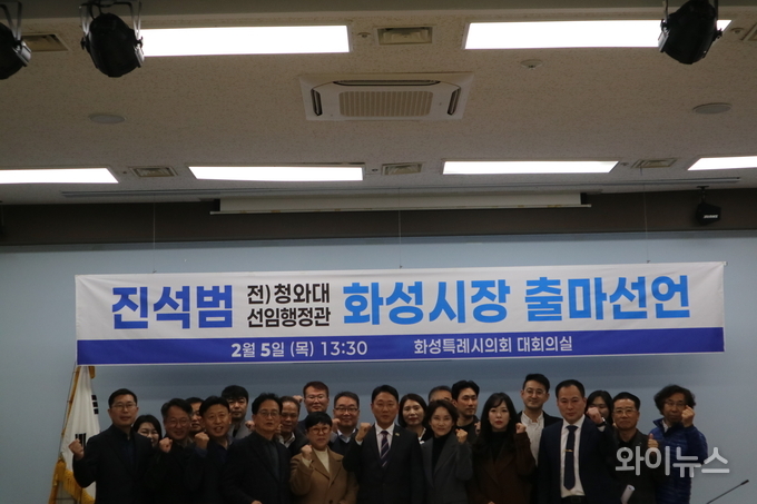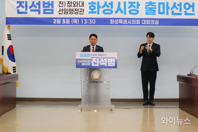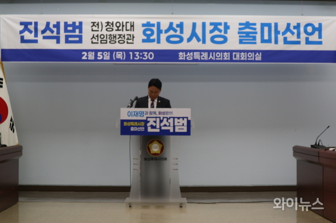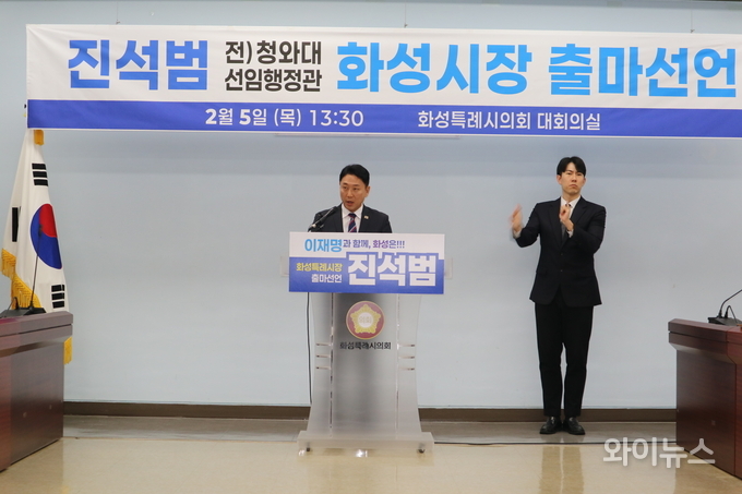 [와이뉴스] 진석범 더불어민주당 화성특례시장 출마예정자가 5일 오후 화성특례시의회 1층 대회의실에서 기자회견을 열고 6·3 지방선거를 앞두고 화성특례시장 후보 출마를 공식 선언했다.