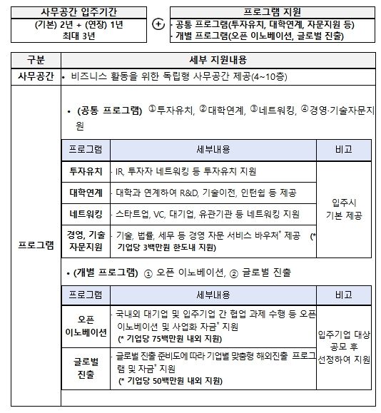 이번에 모집하는 입주기업은 K-StartHub 개관 이후 처음으로 입주를 시작하는 기업들로 사업의 시작을 함께하게 된다. 입주기업은 독립형 사무공간을 비롯해 회의실, 라운지 등 업무 인프라가 제공되며, 비입주기업도 멤버십 형태로 공유오피스를 이용할 수 있다. 또한, 창업기업들의 원활한 경영을 위해 기술·법률·세무 등에 관한 자문 서비스, 오픈이노베이션·글로벌 진출·투자 연계 등 스케일업 프로그램도 함께 지원받을 수 있다.