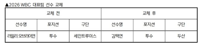 [와이뉴스] KBO 전력강화위원회는 부상으로 인해 WBC 참가가 어려워진 세인트루이스 라일리 오브라이언을 대체할 선수로 두산 김택연을 확정하고 WBC 조직위에 선수 교체 승인을 요청했다.