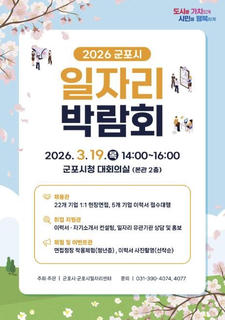 [와이뉴스] 군포시는 오는 3월 19일 오후 2시부터 시청 대회의실에서 ‘2026년 군포시 일자리 박람회’를 개최한다. 이번 박람회는 지역 내 우수 기업과 구직자가 직접 만나는 채용의 장으로 제조, 서비스, 물류배송, 의료복지 등 다양한 분야에서 폭넓은 취업 기회를 제공할 예정이다.