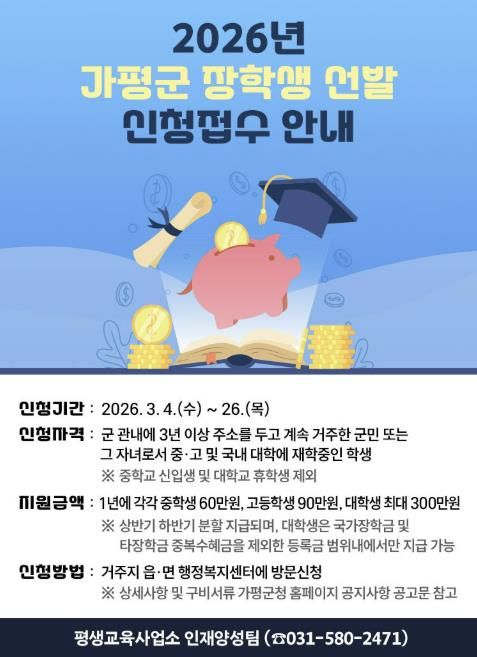 [와이뉴스] 가평군이 지역 학생들의 균등한 교육 기회를 보장하고 우수 인재를 육성하기 위해 2026년도 장학생 선발에 나선다.