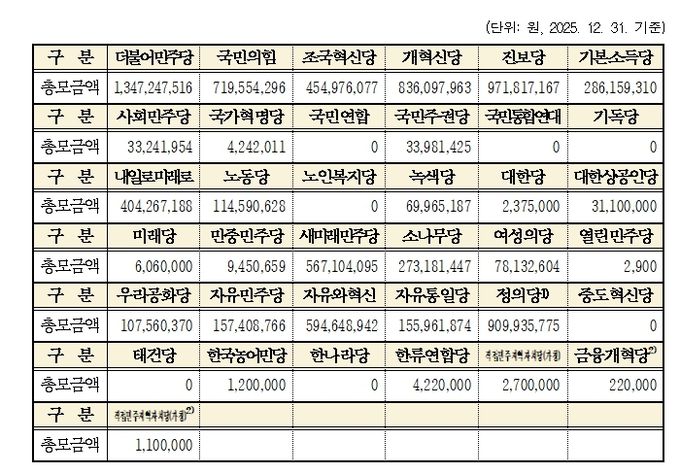 [와이뉴스] 중앙선거관리위원회는 2025년도 중앙당후원회와 국회의원후원회의 후원금 모금내역을 집계한 결과, 37개의 중앙당(중앙당창당준비위원회 포함)후원회가 총 81억 7천8백여만 원을, 303개의 국회의원후원회가 총 608억 3천2백여만 원을 모금했다고 밝혔다.