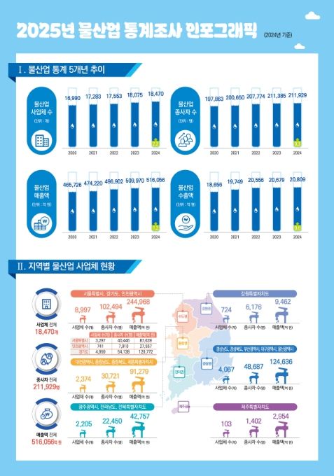 2024년 기준 물산업 사업체 수는 전년도(1만 8,075개) 대비 약 2.2% 증가한 1만 8,470개로 나타났다.